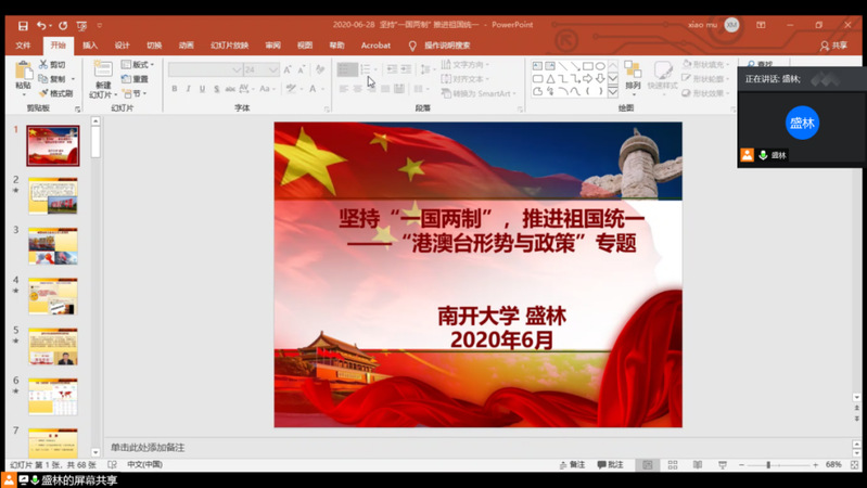 为全面贯彻落实党的十九届四中全会精神、落实教育部办公厅关于《高校“形势与政策”课教学要点(2020年上辑)》的要求,6月28日,马克思主义学院盛林教授以“坚持‘一国两制’ 推进祖国统一”为主题,进行了“形势与政策”课专题讲座。马克思主义学院、生命科学学院全体本科生通过在线平台参加了此次课程学习。