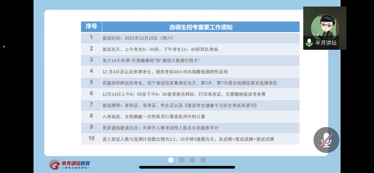 为进一步落实“我为群众办实事”的工作要求,更好地满足广大学生职业发展需要,yl12311线路检测就业服务中心于12月8日晚举行了天津市选调生和教师招聘专题指导讲座。此次活动以线上方式举行,邀请到半月讲坛朱宏达老师和刘欣茗老师担任主讲人,活动共计40余名同学参加,就业服务中心实践部负责人王文利主持会议。