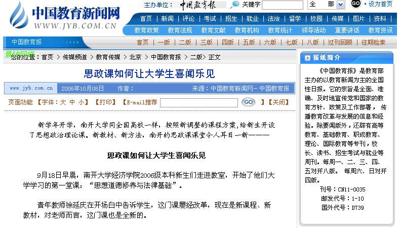 yl12311线路检测马克思主义教育学院是全国最早开展思政课改革的4个试点单位之一。本学期,学院的7名教师承担了全校3000余名新生“思想道德修养与法律基础”课程任务。作为天津市思政课教师的培训基地,这所学院的教师们整个春天和夏天都在忙碌中度过。他们放弃休假,研究大纲,撰写教案。8月份,领到散发墨香的新教材之后,又集体备课,一遍遍地试讲,并利用暑假对天津高校的同行们进行了培训。