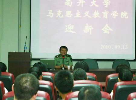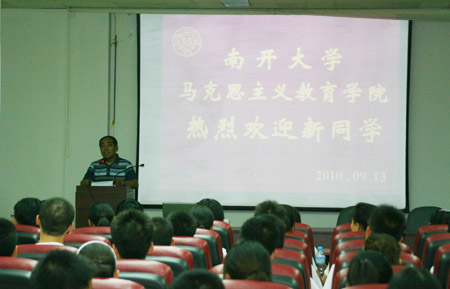 赵院长首先对2010级新生的到来表示了衷心的祝贺,并简要地介绍了我院的专业概况和发展历程,赵院长对2010级新生提出了“博读、广闻、深思、成才”的期待,并以“立志传承马列 拓宽知识领域 全面提高素质 积淀成才奉献”来勉励2010级新生,希望大家能够珍惜寸光寸阴,成长成才。