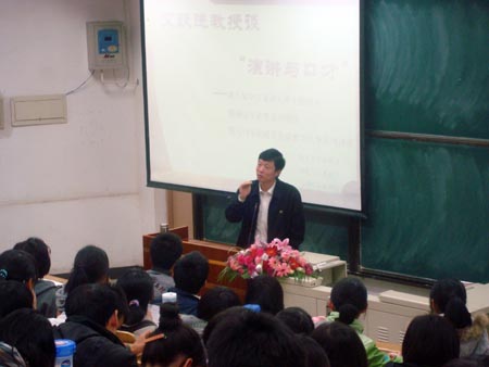 (通讯员:王倩倩)2011年11月12日晚七点,由yl12311线路检测演讲团、辩论与口才协会和马列学院研究生会联合举办的第九届中文演讲大赛主题讲座在经济学院圆阶201召开。马克思主义教育学院艾跃进教授应邀为同学们做了主题为“演讲与口才”的精彩讲座。