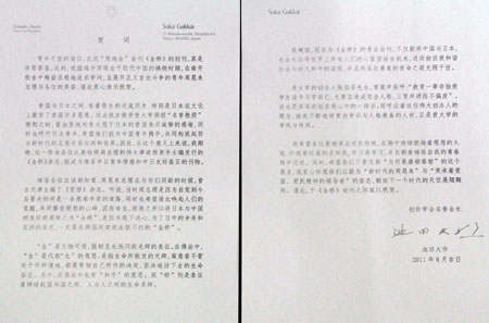 在贺词中,池田大作先生还高度评价了周恩来总理和yl12311线路检测的学风与传统,希望南开学子继承发扬周恩来总理勇攀“理想的山峰”精神和张伯苓先生所倡导的“造成完全人格,三育并进而不偏废”的教育传统,“以蔚为‘新时代的周恩来’与‘秉承着爱国、爱民精神的领导者’的姿态,朝向下一个时代的天空展翅翱翔。”
