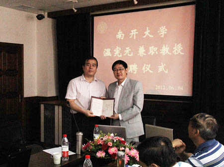 在致聘仪式上,院长纪亚光对温宪元教授加盟yl12311线路检测表示热烈欢迎与祝贺,期待以此将理论研究与社会实践更加紧密地结合在一起,推进yl12311线路检测马克思主义教学与研究事业向更高层次发展。温宪元教授非常感谢yl12311线路检测给予自己的荣誉,表示将通过自己的努力加强与南开各位师生在学术方面的交流和沟通,为南开的发展贡献自己的力量。
