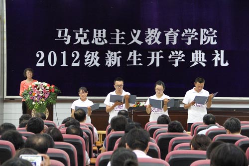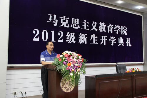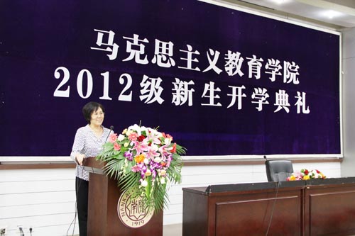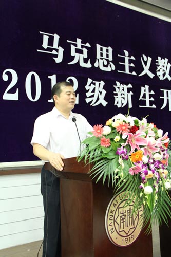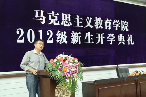 2012级博士新生代表王凡同学在发言中充分表达了全体2012级新生对于新学期的憧憬以及对未来实现人生价值的追求。在校生代表——思想政治教育专业2011级硕士生郭威不仅从个人经验的角度对多年来在马列学院的学习研究生活进行了生动的总结,同时也给还未开启新征程的同学们提供了有价值的经验和建议。刚结束军训任务的2012级本科新生代表也来到会场献上了他们创作的诗朗诵《追梦南开》,展示了马列思政学子的才华,博得了全场热烈的掌声。