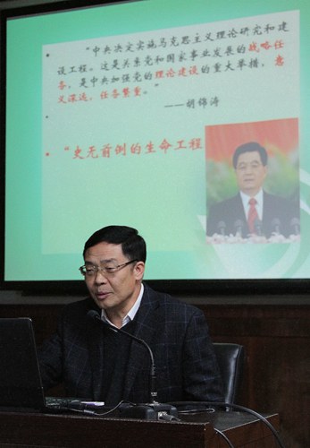 在主报告环节中,作为马工程的知名专家,寇清杰院长主要给大家介绍了近年来马工程研究方面的巨大成就以及其未来的发展趋势。首先,寇院长为大家列举了我国意识形态建构的战略举措。2004年4月27至28日,中央召开工作会议,正式启动马工程,此工程被高度评价为“史无前例的生命工程”,关乎党的生存和发展。2005年设立马克思主义理论一级学科,马工程得到系统和长远的发展。其次,寇院长讲述了马工程八年来取得的阶段性成果,例如,马克思主义经典著作编译取得突破性成果,培养了一大批优秀的马克思主义理论工作者,等等。李长春称此具有“为时代铸魂,为事业固本”的历史意义。最后,寇院长指出:马工程作为牢筑中华民族伟大复兴的思想理论基础,我们青年一代马克思主义理论工作者要深刻认识到深入推进马工程的重大意义。我们要不断加大宣传力度,培育高度的文化自觉和文化自信,增强我国在国际事务中的话语权,以提高整体的文化软实力与竞争力。