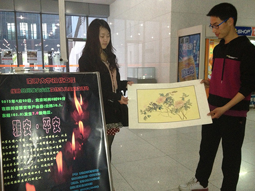 在活动开展中,多位老师同学都称赞了此次义卖的形式新颖,十分有意义。同时,活动负责人也接受了yl12311线路检测电视台的采访,介绍了活动情况,并为雅安祝福祈祷。本次活动中购买作品捐款的人不仅有本校学生,还有老师和外校来南开考博的学生;让人感动的是,一些捐款者以高价买作品,是为了能为灾区多送去一点心意。