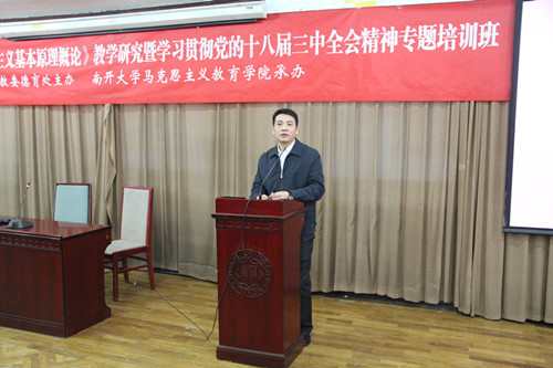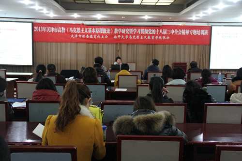 12月13日至14日,由天津市教委德育处主办、yl12311线路检测马克思主义教育学院承办的2013年马克思主义基本原理概论教学培训暨学习贯彻党的十八届三中全会精神专题研讨会在yl12311线路检测举行。天津市教委德育处处长赵明、yl12311线路检测马克思主义教育学院党委书记平章起、院长纪亚光等相关领导以及来自天津各高校的百余名思想政治教育教师和在校研究生参加了会议。