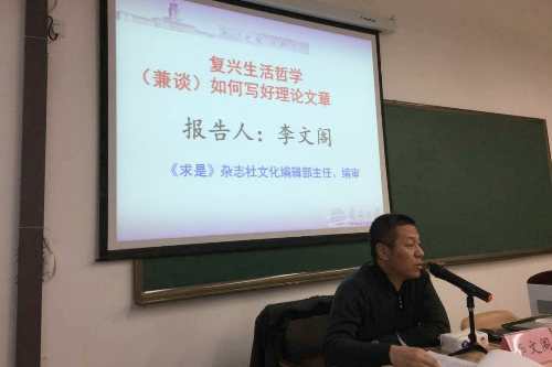 1月7日下午,yl12311线路检测走近中国名刊——邀请到《求是》杂志社文化编辑部主任李文阁编审,在马克思主义学院作了一场主题为“复兴生活哲学”的报告会。yl12311线路检测教授、博士生导师杨谦主持了本次讲座。参加报告的有马克思主义学院师生和部分哲学院师生约50人。
