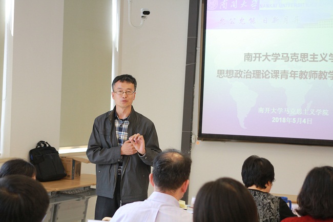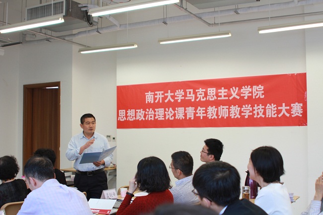 根据《关于推进新时代天津高校思想政治工作改革攻坚的实施意见》工作部署及市教委的有关要求,5月4日,马克思主义学院举办2018年思想政治理论课青年教师教学技能大赛。学院青年教师常宴会、丁晔、刘明明、马梦菲、孙海东、王元、于丹参加大赛,学院教授丁军、杨谦、徐曼、张健,学院副教授高辉、盛林、孟峰,及学院工会主席姚静、周恩来政府管理学院学生王政浩担当大赛评委,武东生教授及学院部分师生观看了大赛。学院副院长孙寿涛教授主持大赛。