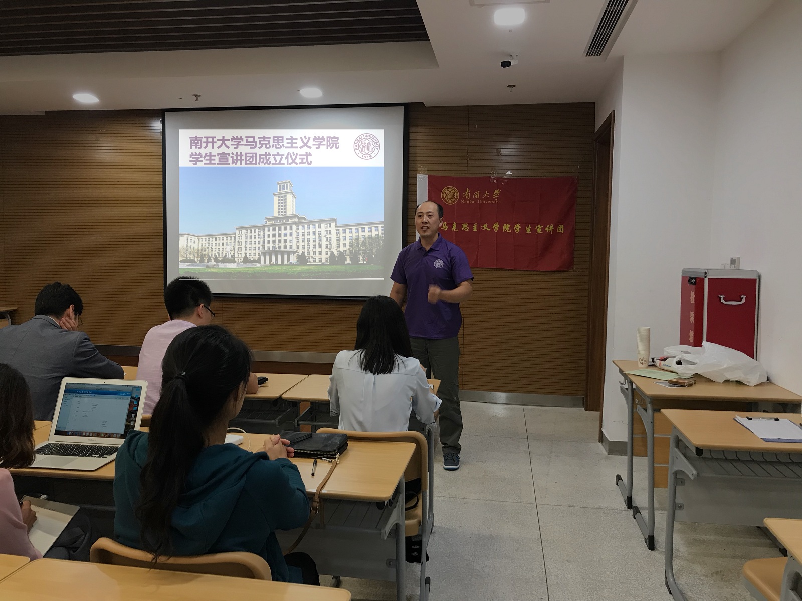 首先,宣讲团指导老师朱雪薇致辞,她指出,马克思主义学院学生宣讲团充满了朝气、体现了新时代马克思主义学院的特色,希望同学们能够将公能精神继续传承下去,展现出南开马院的风采。