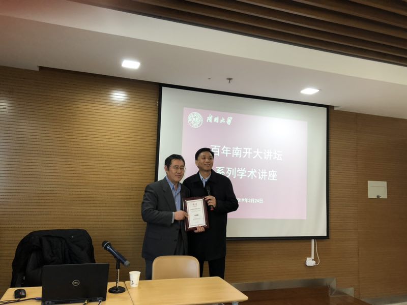 讲座开始前,马克思主义学院院长王新生为辛向阳颁发“百年南开大讲坛主讲人”证书。
