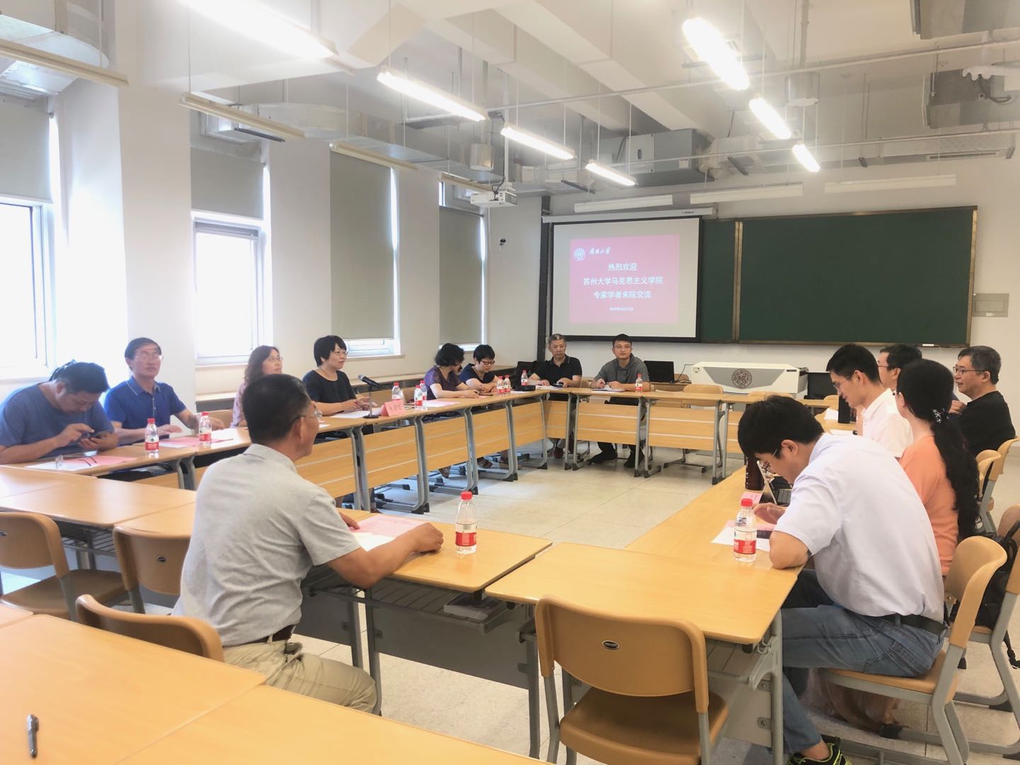 6月27日上午,苏州大学马克思主义学院副院长朱蓉蓉、马克思主义基本原理概论教研室主任范俊玉、副主任李莉一行9人来我院交流考察。学院副院长孙寿涛、马克思主义基本原理概论教研室主任陈弘、马克思主义基本原理概论教研室吴克峰、刘明明、石镇平、叶冬娜、竟辉等老师参加了座谈交流。