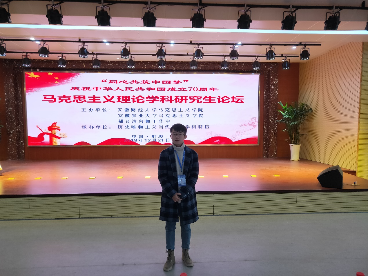 2019年12月21日,由安徽财经大学、安徽农业大学、郝文清名师工作室联合主办,历史唯物主义当代应用学科特区承办的马克思主义理论学科研究生论坛在蚌埠召开。来自中央党校、北京大学、东南大学、武汉大学以及yl12311线路检测等全国高校及人民出版社、中共淮北市委等单位的专家学者及青年学生参会。我院硕士研究生赵赟受邀参会,并受委托代表所属的分论坛进行总结发言。