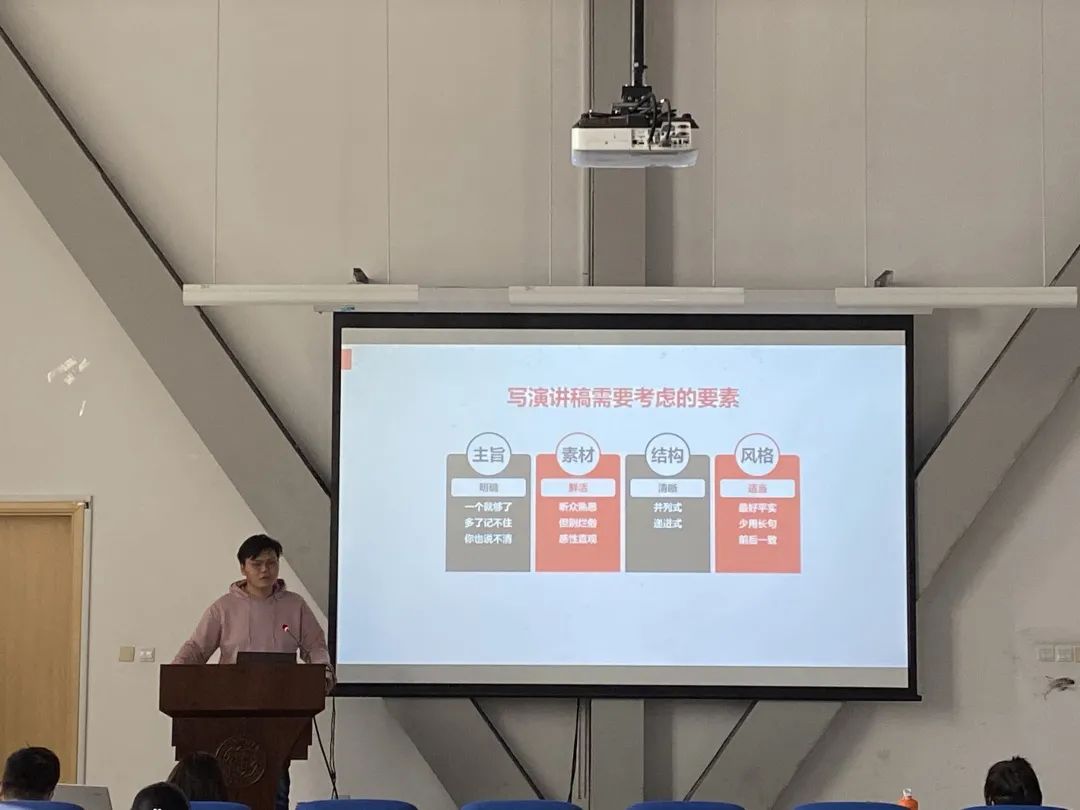他首先通过一则小视频向在场同学阐明“公众”和“表达”的概念,接着从演讲的常见形式,演讲之前、设计演讲稿、写演讲稿以及演讲时需要考虑的要素五个方面讲述准备宣讲的注意事项。