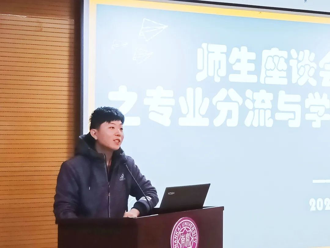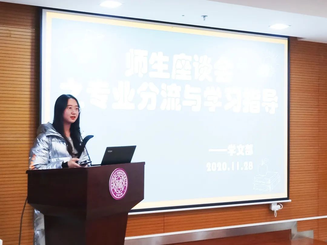 近日,马克思主义学院师生座谈会之专业分流与学习指导专题在学院113室举行,本次活动邀请到本科教学部主任余一凡老师、18级本科生王伯元、19级本科生董晓乐、19级本科生崔雪、19级本科生凌张可为同学们进行指导,19级本科生和部分20级本科生参加座谈会。