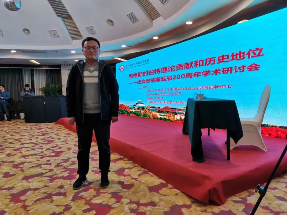2020年11月28-29日,由马克思主义理论与中国实践湖北省协同创新中心、武汉大学马克思主义学院、中国人学学会和《马克思主义理论学科研究》杂志社共同主办的“恩格斯的独特理论贡献和历史地位——纪念恩格斯诞辰200周年”学术研讨会在武汉大国际学术交流中心召开。研讨会采取线下举办、线上同步直播的形式进行,吸引1.3万人次在线观看直播。来自北京大学、清华大学、复旦大学、中山大学、中国社会科学院、中共中央党校等高校和科研院所,以及《北京大学学报》、《武汉大学学报》、《江汉论坛》、《马克思主义理论学科研究》等杂志社的近270位专家学者和学生代表出席会议。我院青年教师张留财受邀参加会议。