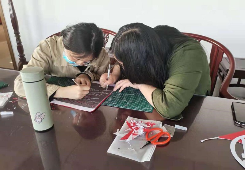 党员们在图书馆古籍特藏党支部的同志的带领下,拿起剪刀、刻刀,聚焦剪纸作品,沿着纸上的纹路,回忆着每张剪纸背后展现的历史故事。在剪纸过程中,古籍特藏党支部的同志们与党员们重温了湘江会战、遵义会议、爬雪山过草地、胜利会师等红军长征中的重大历史事件。
