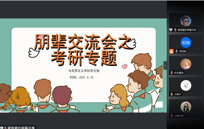 5月15日上午,马克思主义学院考研专题朋辈交流会通过线上会议成功召开。本次交流会邀请到张楠、王卓、钟斌辉、邹傲凡四位优秀的学长学姐,结合自身经历向大家传授宝贵的考研经验与指导建议。