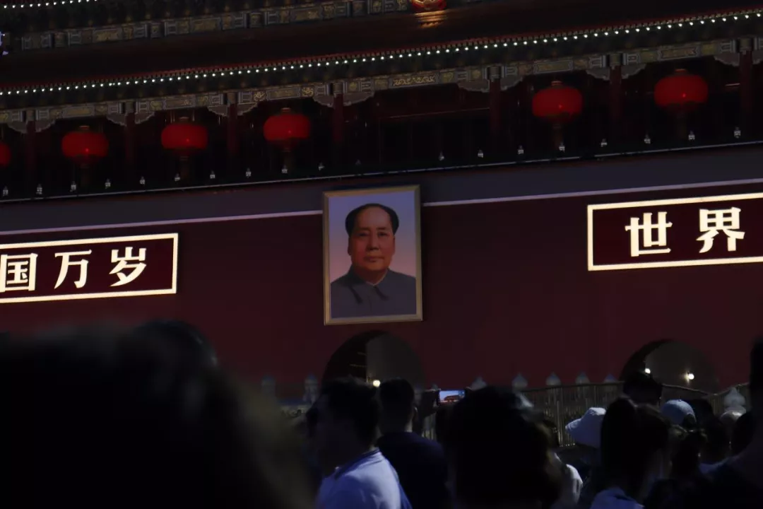 傍晚时分,天安门前的降旗仪式刚刚结束,天空渐渐暗了下去,两旁的灯光渐渐亮起。广场上仍然聚集着很多人,有已经步入耄耋之年的老者,也有因为疲惫而在父母臂弯里休息着的孩童,他们不约而同地聚集在天安门城楼中央,看向暮色中的主席像,而画像中的主席也正在亲切地望向他们。开国定鼎,七十秋矣,我在人声鼎沸、一片欢庆之中,拍下了两束目光跨越百年的相遇。