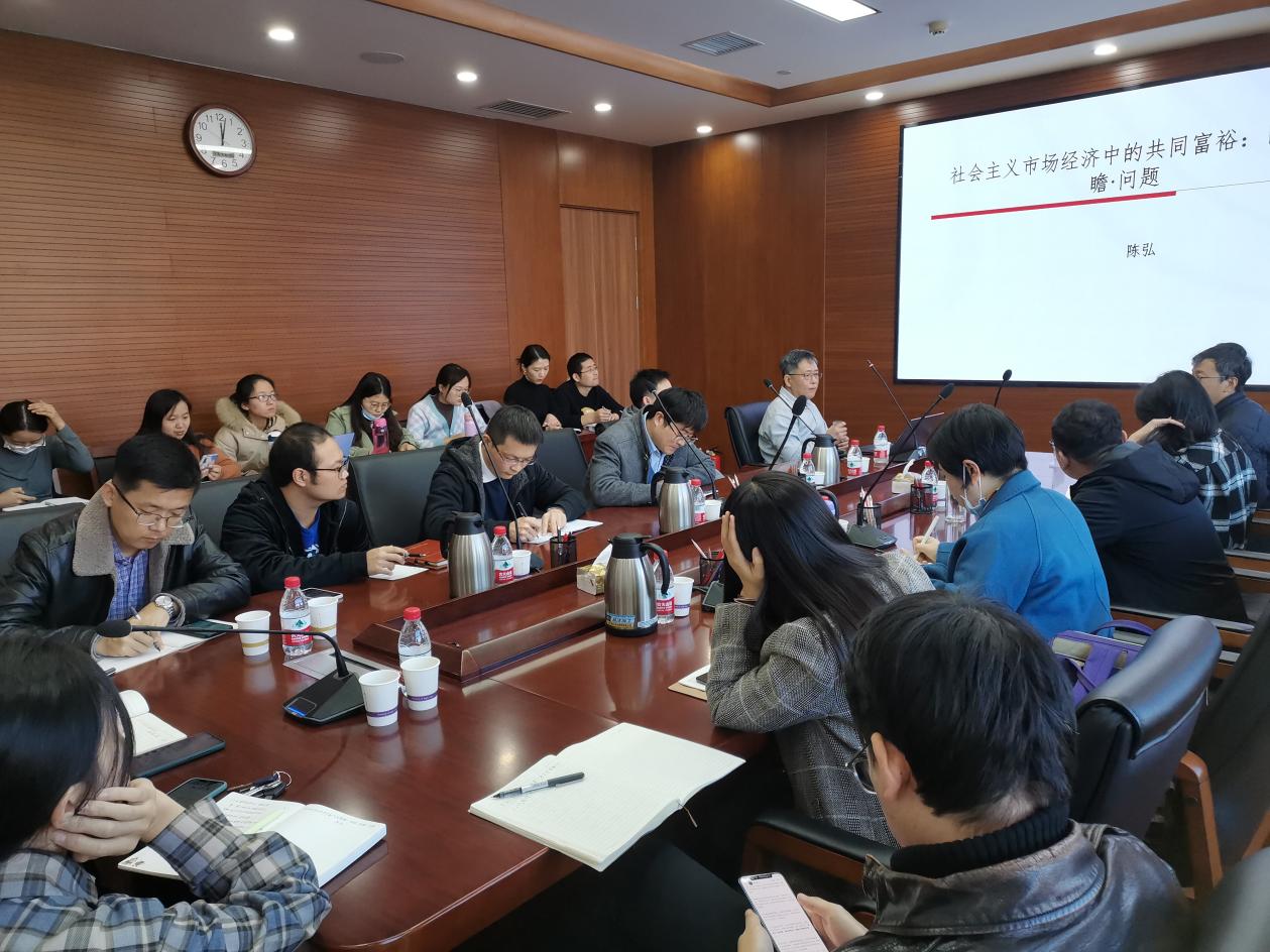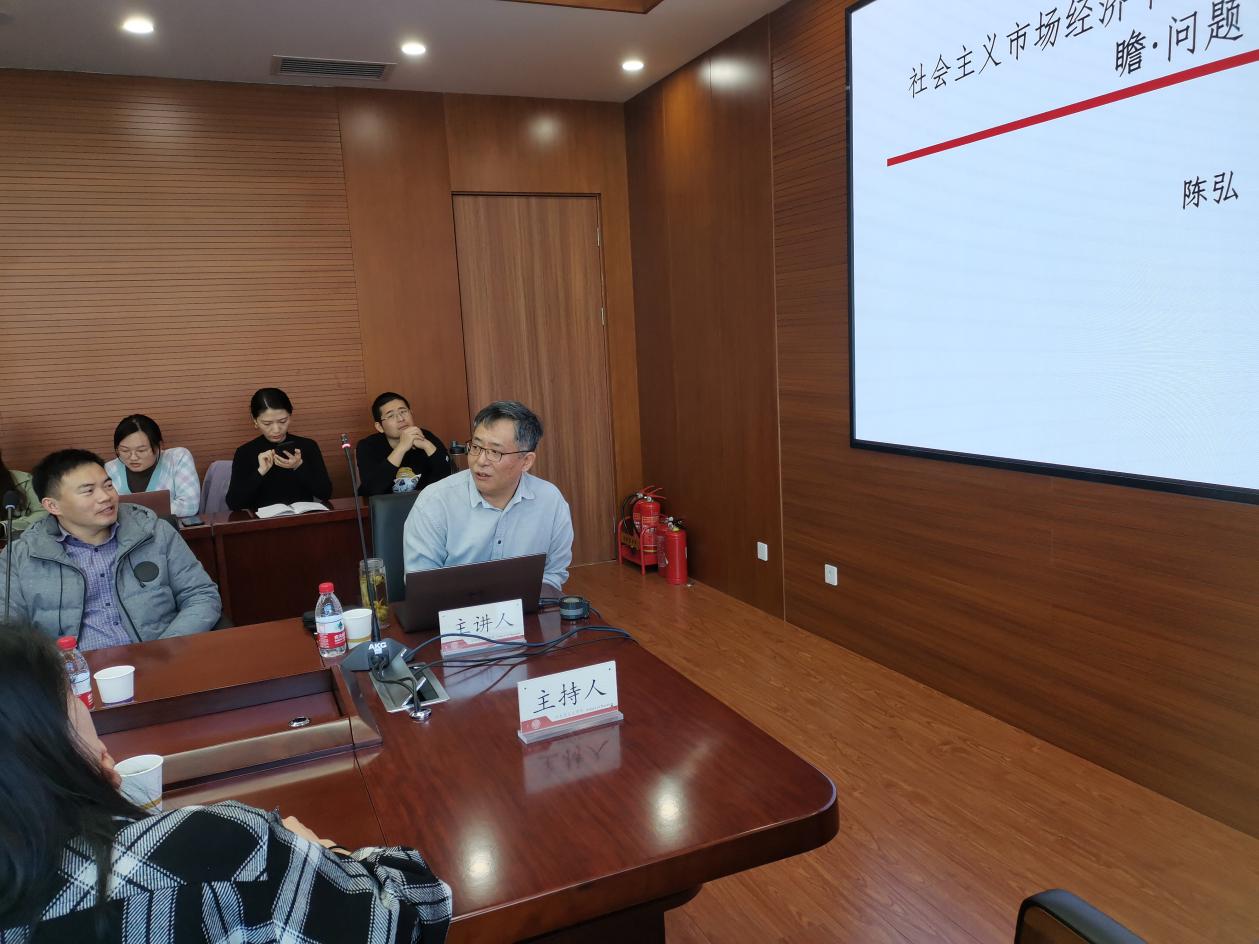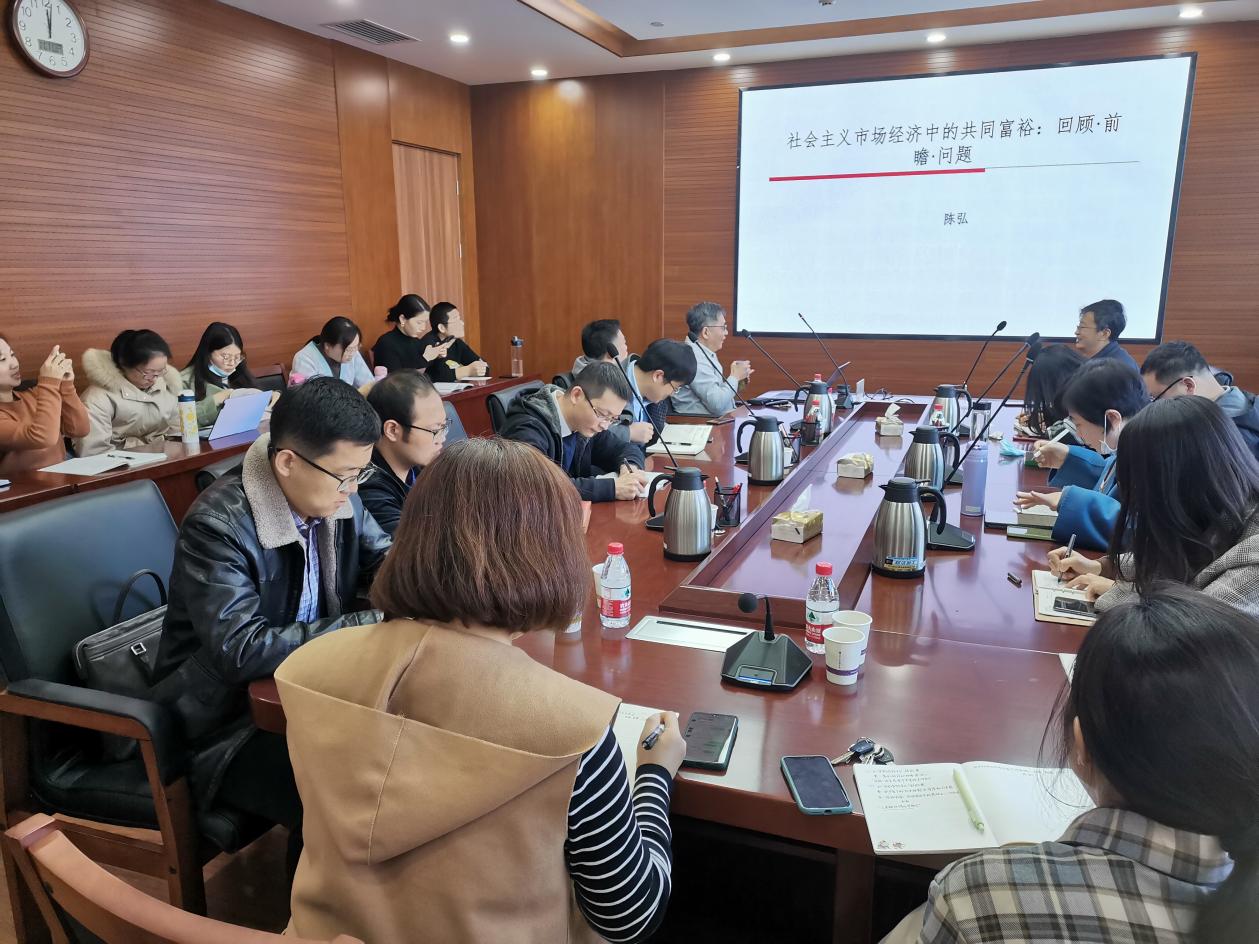 11月11日,马克思主义学院“双周学术沙龙”第四期在321教室举行,我院陈弘教授作了题为“社会主义市场经济中的共同富裕:回顾、前瞻与问题”的专题讲座。本次沙龙由马克思主义学院副院长孙寿涛教授主持。