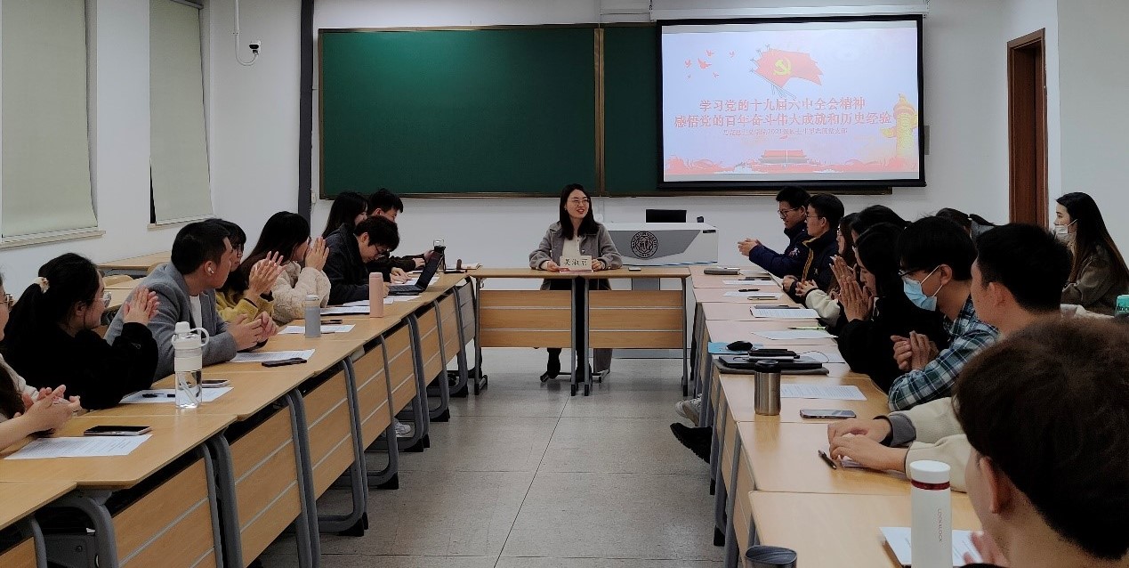 11月17日,yl12311线路检测2021级硕士生望志班党支部组织师生共学党的十九届六中全会精神,班导师吴淑丽出席并领学全会公报精神,组织委员郭昕睿主持。