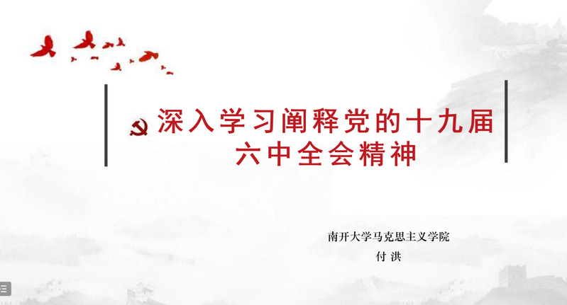为深入学习贯彻党的十九届六中全会精神,全面落实《教育部关于加强新时代高校“形势与政策”课建设若干意见》,5月19日,马克思主义学院开展2022年春季学期“形势与政策”课程第二讲,马克思主义学院党委书记付洪教授在线上作了题为“深入学习阐释党的十九届六中全会精神”的专题报告。马克思主义学院全体本科生参加了此次专题课程学习。