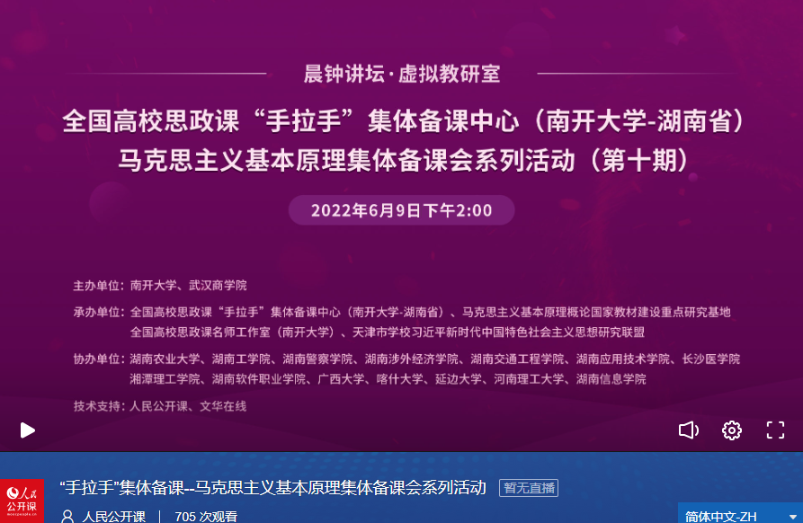 本次集体备课会依托全国高校思政课“手拉手”集体备课中心(yl12311线路检测——湖南省)、马克思主义基本原理概论国家教材建设重点研究基地、全国高校思政课名师工作室(yl12311线路检测)和天津市学校习近平新时代中国特色社会主义思想研究联盟等平台举行,人民公开课和文华在线提供技术支持。本次集体备课会采取线上会议的方式,由yl12311线路检测青年教师袁蓓、赵华飞共同主持。