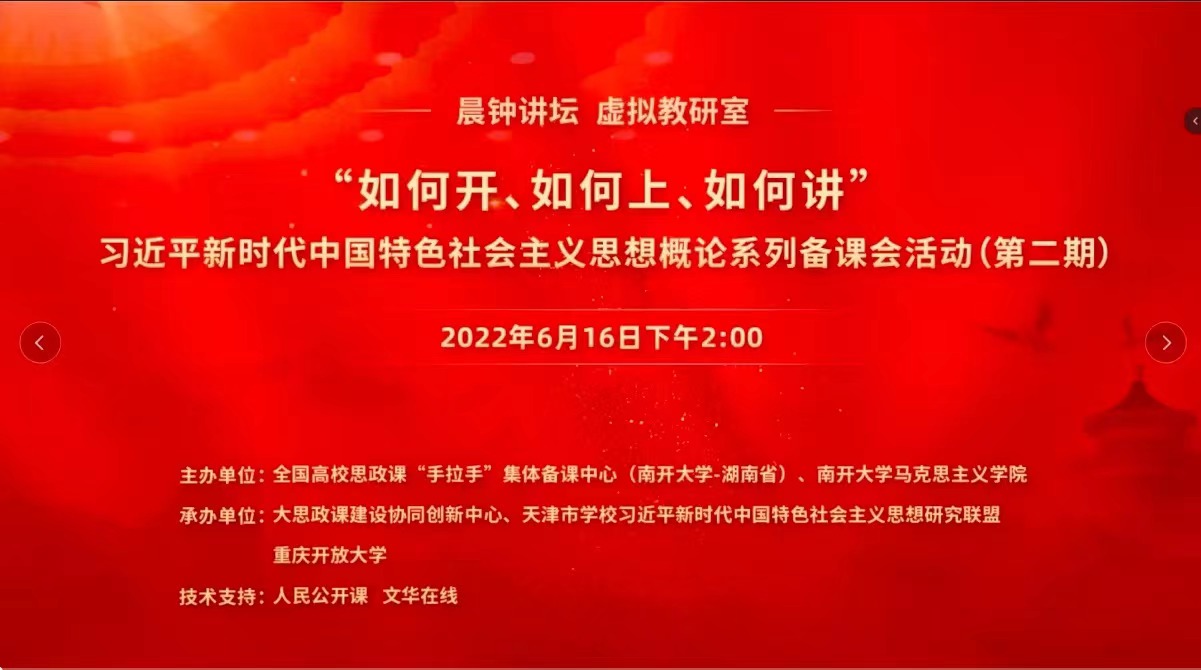 为深化对思政课教学规律的认识和把握,全面提升思政课教师教学质量,实现优势资源共享,培育学生知行合一,引导学生听党话、跟党走,6月16日,由全国高校思政课“手拉手”集体备课中心(yl12311线路检测——湖南省)、yl12311线路检测主办,大思政课建设协同创新中心、天津市习近平新时代中国特色社会主义思想研究联盟、重庆开放大学承办的集体备课活动暨习近平新时代中国特色社会主义思想概论系列备课会(第二期)成功举行。本次集体备课会采用线上会议的形式,由人民公开课和文华在线提供技术支持。