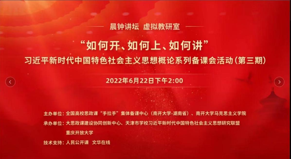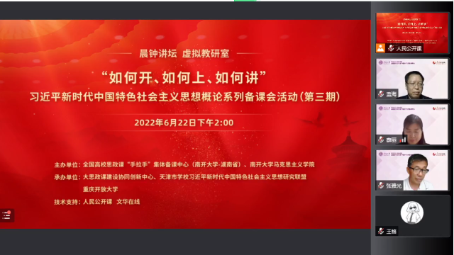 为集中挖掘和探讨教学中的重点难点问题,更好凝聚不同院校专家学者的智慧力量,将思政课程改革创新成功的做法和经验融入培养时代新人的全过程,进而打造教学改革样板和精品,6月22日,由全国高校思政课“手拉手”集体备课中心(yl12311线路检测——湖南省)、yl12311线路检测主办,大思政课建设协同创新中心、天津市学校习近平新时代中国特色社会主义思想研究联盟、重庆开放大学承办的集体备课活动暨习近平新时代中国特色社会主义思想概论系列备课会(第三期)成功举行。本次集体备课会采用线上会议的形式,由人民公开课和文华在线提供技术支持。