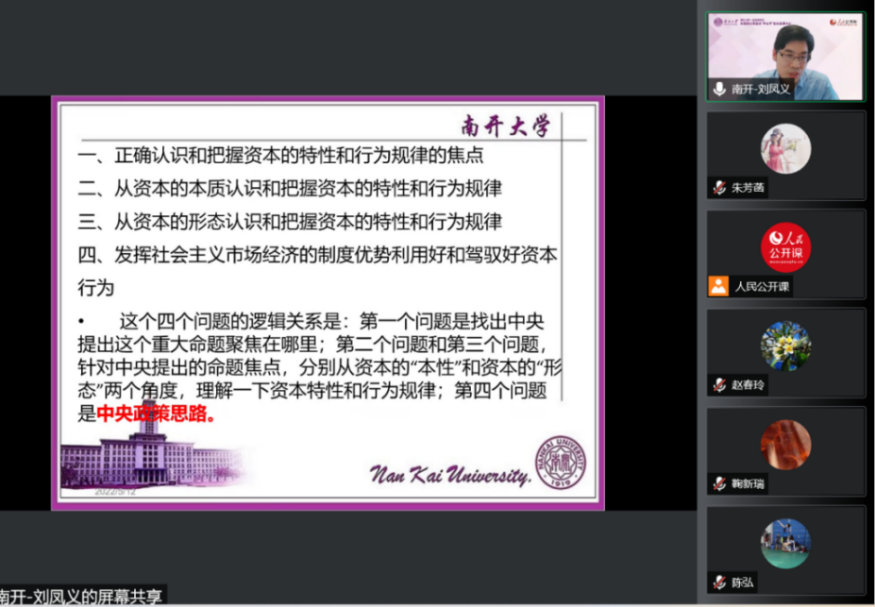 5月12日,yl12311线路检测院长刘凤义教授以“正确认识资本的特性和行为规律”为题,结合中共中央政治局第三十八次集体学习的内容,举办讲座,将热点问题与马原理课程的理论内容相结合。刘教授认为,“正确认识和把握资本的特性和行为规律”这个命题,要聚焦于“社会主义与市场经济的结合”。他从“资本的本质”和“资本的形态”两个方面具体分析如何“认识和把握资本的特性和行为规律”。他从五个方面对如何实现驾驭资本进行阐释,并强调要“发挥社会主义市场经济的制度优势,利用好和驾驭好资本行为”。本次讲座共有来自全国各地的1114名观众线上观看。