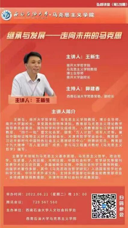 6月21日,王新生教授又应西南石油大学马克思主义学院邀请,以“继承与发展——走向未来的马克思”为题开讲,讲座气氛活泼而热烈。王新生教授以个人在马切拉塔会议上与米切尔教授的谈话入手,讲授了习近平新时代中国特色社会主义思想的理论创新是21世纪的马克思主义。他分别从创新驱动发展战略、党的领导和人民当家作主的有机统一、社会主义现代化强国、绿色发展理念、人类命运共同体等来论证马克思主义在发展中走向未来。针对这一主题,王新生教授还曾赴南京邮电大学、安徽师范大学开展讲座,受众范围十分广泛。