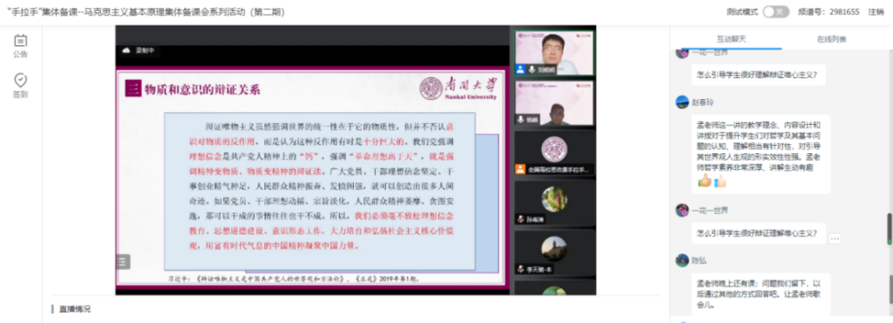 集体备课中心通过举办专题备课、开展学术讲座,通过师生同学同研,通过多渠道多举措宣传推广,已经同全国思政课教师同行形成教研共同体、备课共同体、学术共同体,每周“云研讨”马原理课程教学已常态化、规范化、系统化,虚拟教研室名“虚”实“实”。