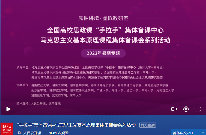 为善用“思政大课堂”传播中国声音,更好把握历史、现在和未来三个维度,讲好中国共产党人耕耘在“希望的田野”上的故事,8月14日,由yl12311线路检测主办,全国高校思政课“手拉手”集体备课中心(yl12311线路检测——湖南省)暨马克思主义基本原理集体备课会系列活动(暑期专题)成功举行。湖南农业大学、湖南工学院、湖南警察学院、湖南涉外经济学院、湖南交通工程大学、湖南应用技术学院、长沙医学院、湘潭理工学院、湖南软件职业技术学院、广西大学、喀什大学、延边大学、中南大学、河南理工大学、湖南信息学院、武汉商学院、南华大学等十几所高校的教师学生协同参与,共计1600余次观看。