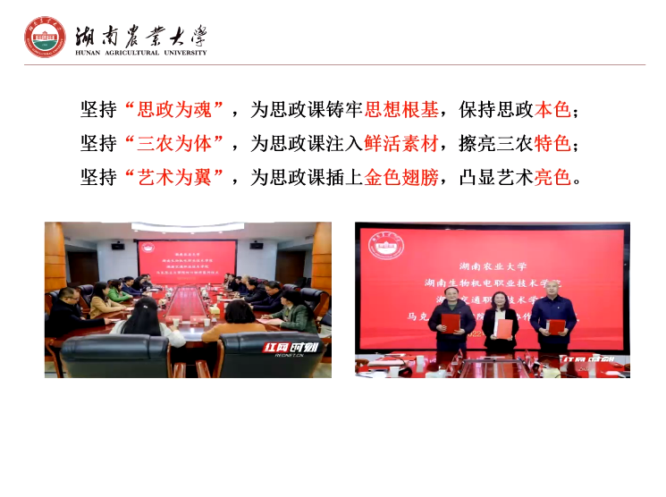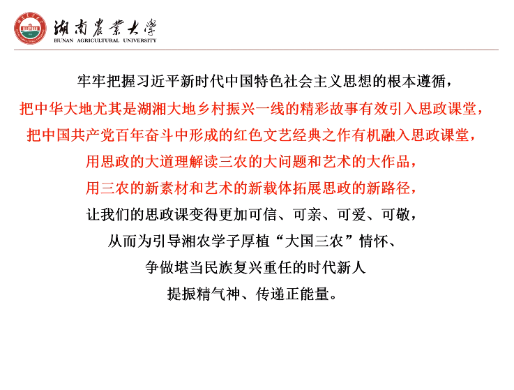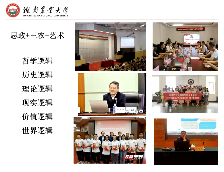 本次集体备课会,首先邀请湖南农业大学马克思主义学院院长胡艺华教授做了题为“‘思政+三农+艺术’——让思政金课深深植根于乡村振兴一线”的教学展示。随着展示的进行,与会师生沉浸在历史与现实交融、思想与艺术交织的氛围中。
