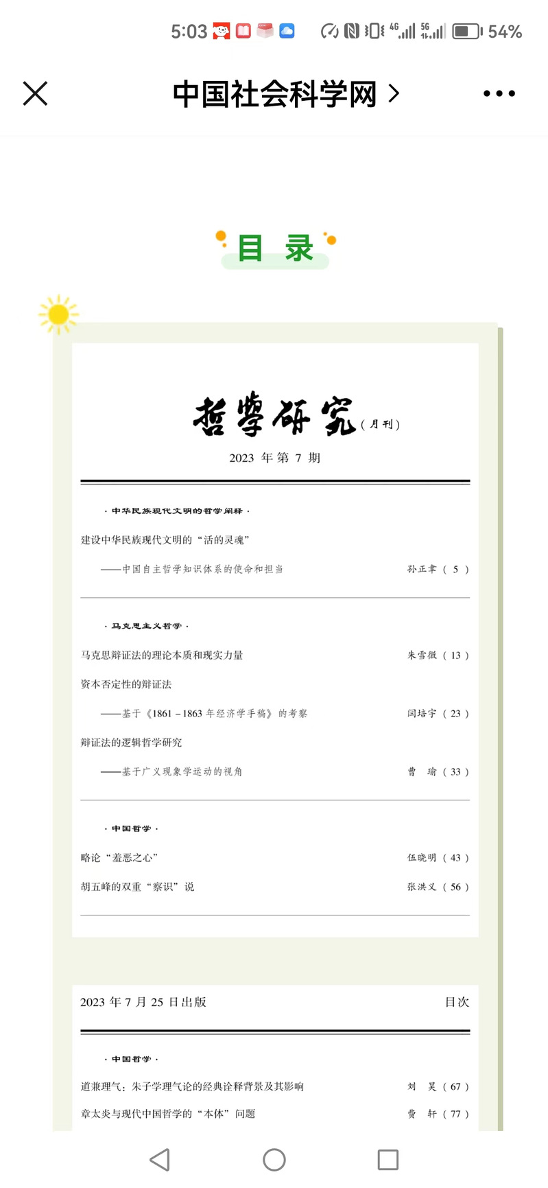 我院朱雪微副教授在《哲学研究》发表文章《马克思辩证法的理论本质和现实力量》。文章认为,理解与把握马克思辩证法的理论本质与现实力量, 对于辩证法的当代课题研究具有十分重要的理论意义与现实意义。 从理论上来说, 马克思辩证法是一种具有批判性与革命性的理论思维方式, 批判性和革命性是其理论本质; 从现实上来讲, 马克思辩证法更是一种批判的和革命的现实力量———批判的现实力量体现为 “在批判旧世界中发现新世界”,革命的现实力量体现为 “在改造旧世界中创造新世界”。 这也体现于马克思主义人类解放的双重使命———批判资本主义社会与建设共产主义社会, 但二者不是相互割裂的, 而是辩证统一的, 即在 “批判资本主义社会中建设共产主义社会”。