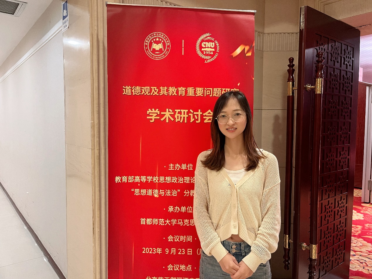 2023年9月22日—23日,在教育部社科司指导下,由教育部高等学校思想政治教育理论课教学指导委员会和“思想道德与法治”分教学指导委员会主办,首都师范大学马克思主义学院承办的“道德观及其教育重要问题研究”学术研讨会在北京召开,教育部社科司司长徐青森,首都师范大学校党委书记缪劲翔,教育部高校思政课总教指委主任委员、“思想道德与法治”分教指委主任委员、武汉大学党委常务副书记沈壮海作会议致辞。全国40多所高校180多名专家学者、优秀论文作者代表参加了本次会议。我院博士生彭钰美受邀参加此次研讨会,并与来自全国各地的专家学者进行了深入的学术研讨和理论学习。