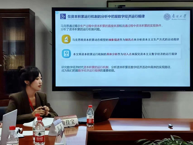 在开幕式上,南京大学马克思主义学院副院长陈建教授代表论坛主办方致辞,突出强调要把马克思主义的基本观点、基本立场、基本方法与当下中国的实践相结合。本次论坛共有一场学术主旨发言,三场主题发言,三个分会场讨论和两个研究生专场讨论。在分会场论坛上,我院朱雪微、顾珊和曲佳宝三位教师分别以《马克思和恩格斯所实现的辩证法的理论革命与实践革命》、《GDP核算与价值总量之谜:基于劳动价值论的再考察》、《马克思资本积累理论与数字经济时代的资本主义积累》为题同与会学者进行了交流学习。在研究生专场论坛上,朱雪微副教授受邀作为研究生专场二的主持人与优秀的青年学生进行了深入的交流。